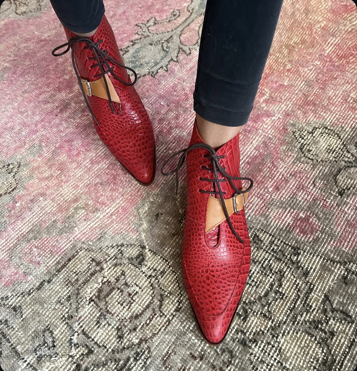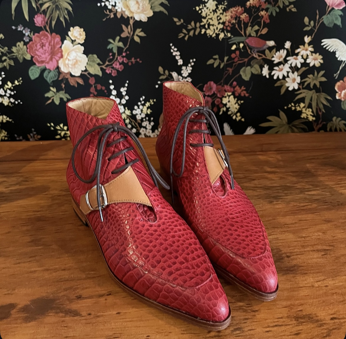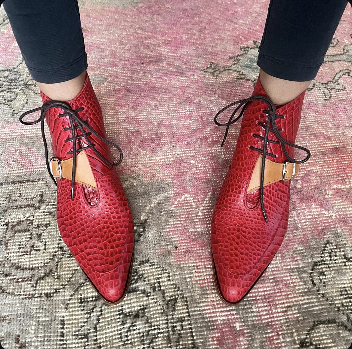 Botín Cayetana cuero coco rojo y cuero camel • a pedido