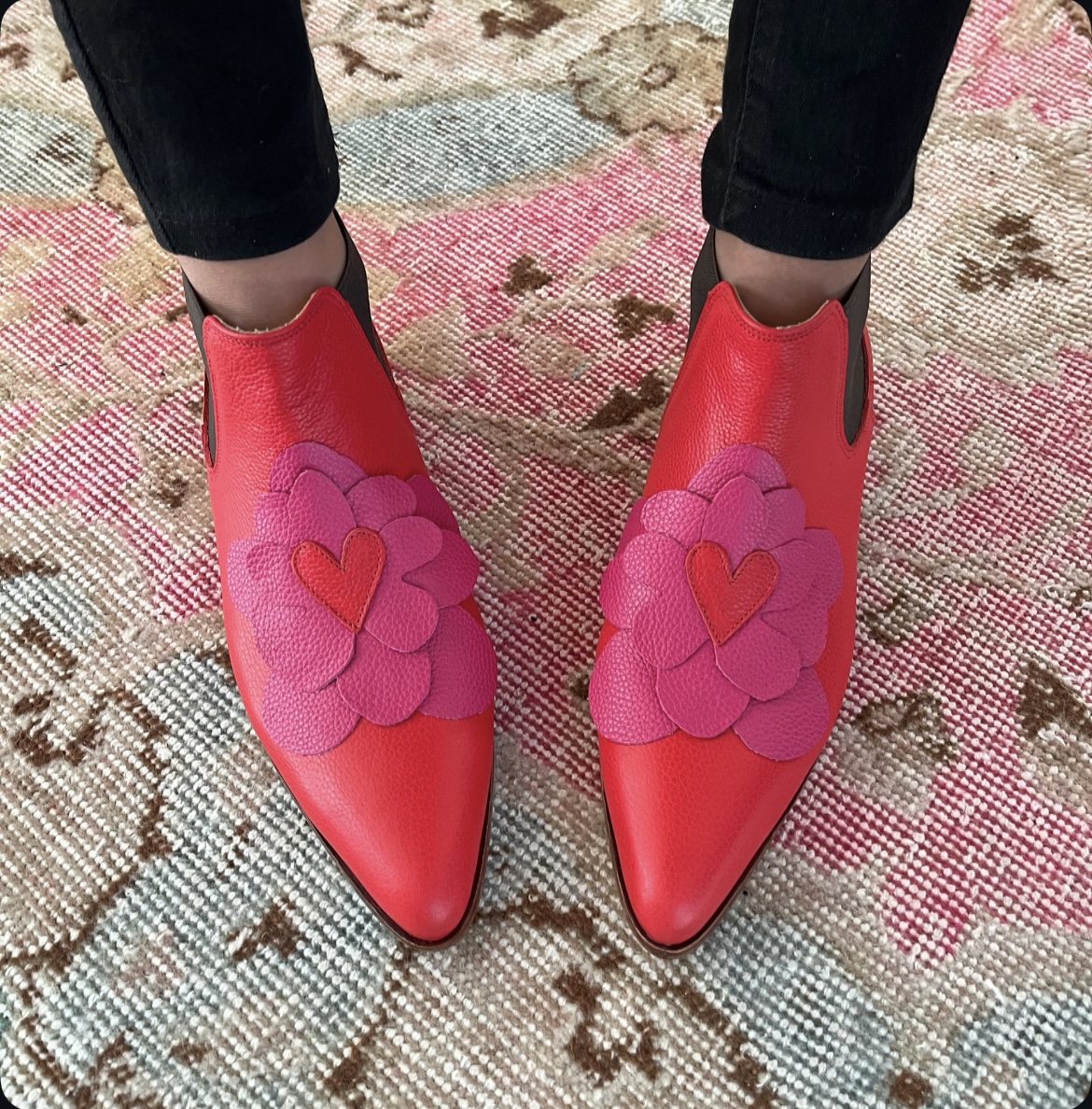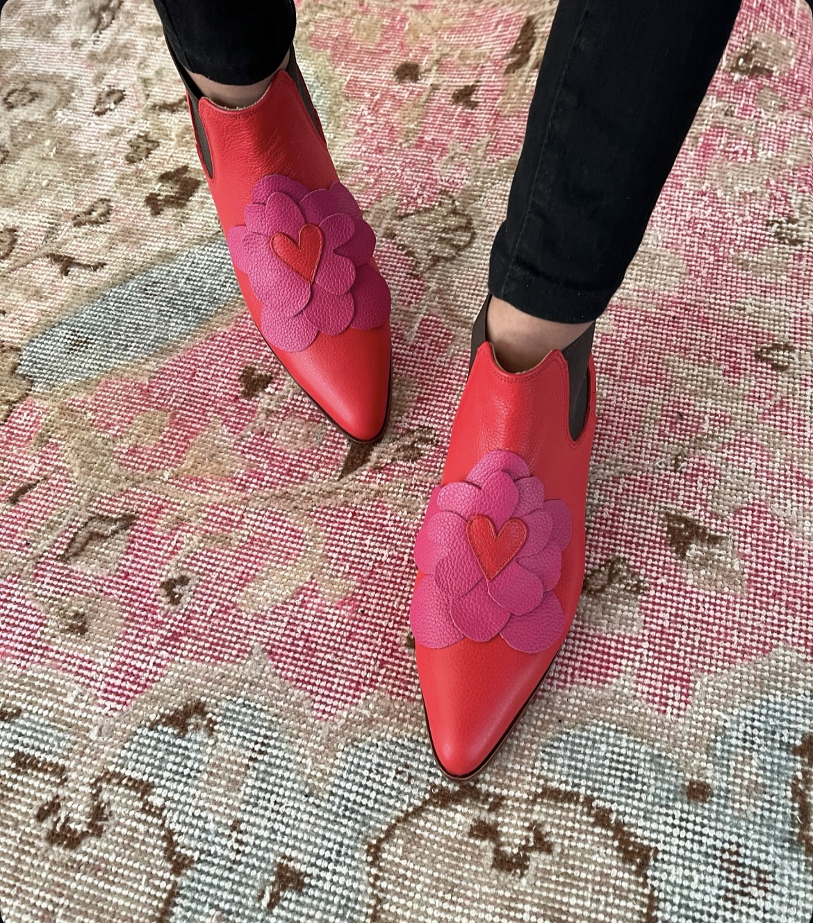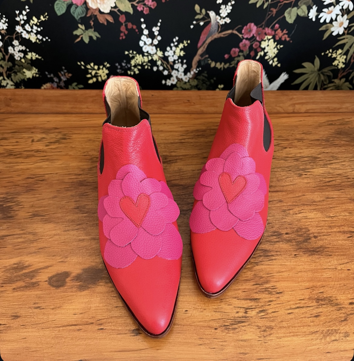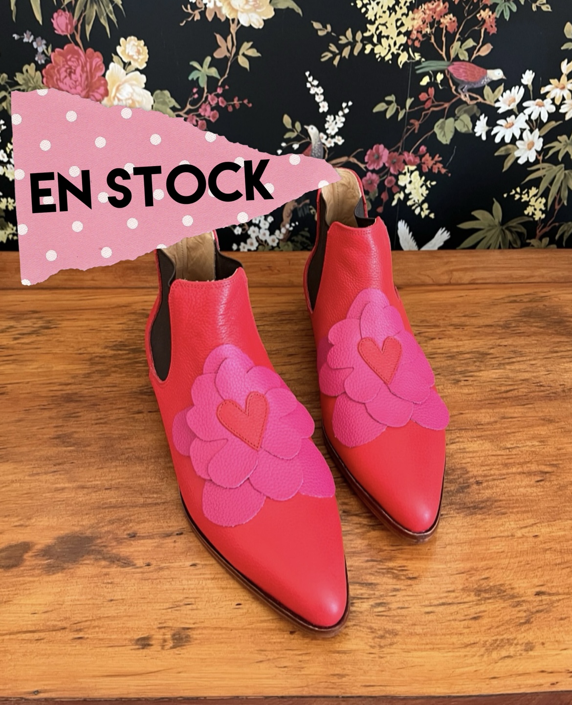 Botín de cuero, forrados en cuero y hechos a mano. Con elásticos laterales y aplicación de flor en empeine. Planta de suela y tacón de 3 cm.