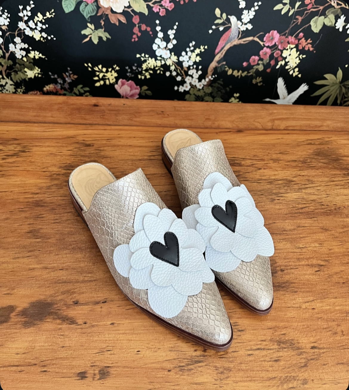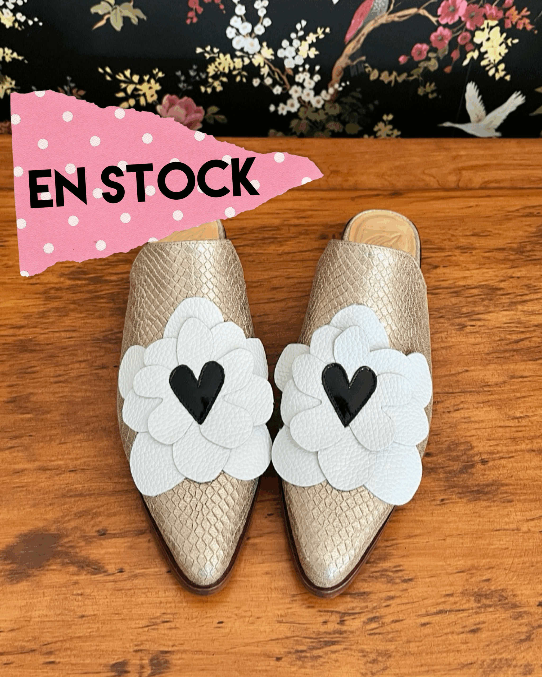 Puntilla de cuero, forradas en cuero y hechas a mano. Con aplicación de flor en empeine. Planta de suela y tacón de 3 cm.