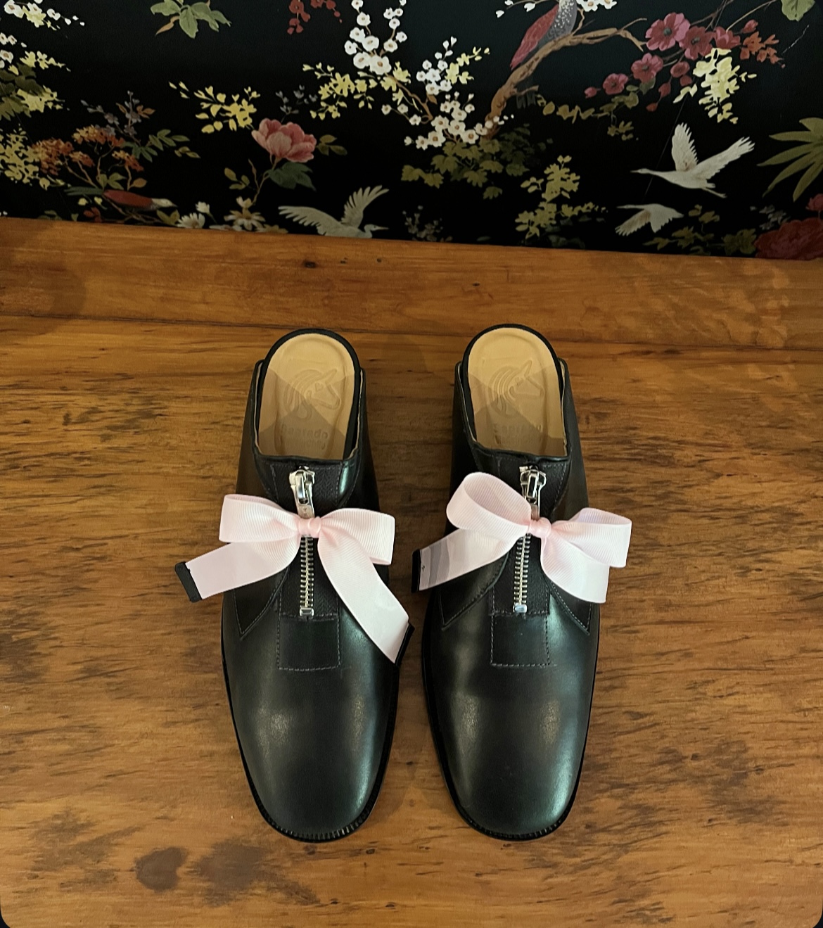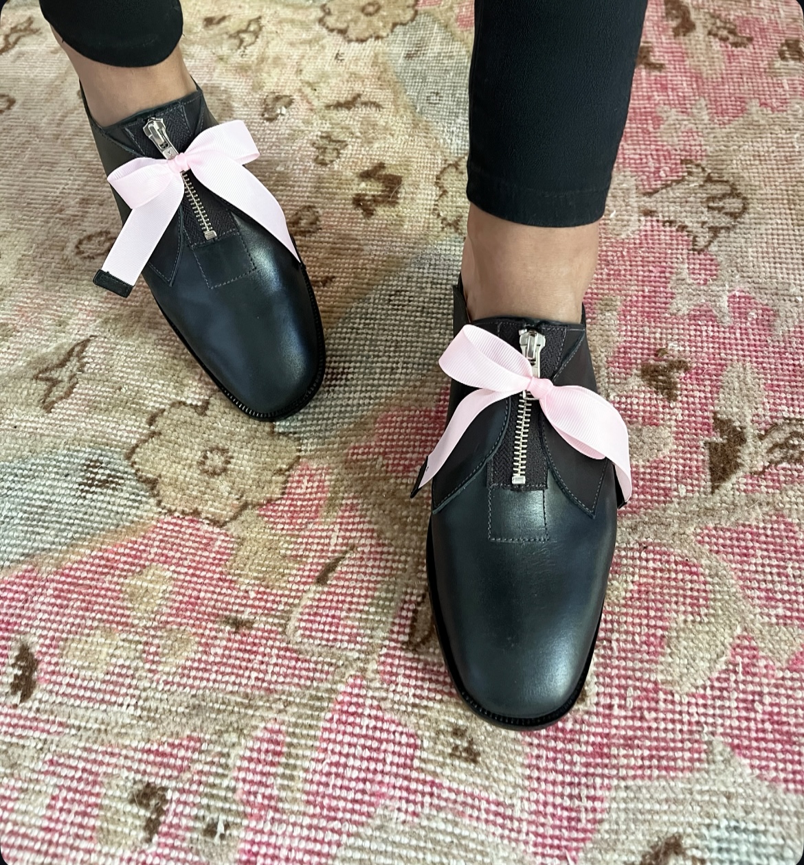Puntilla de cuero, forradas en cuero y hechas a mano, planta de suela y tacón de 4 cm. Con cierre fijo en empeine y cinta con terminación de cuero.