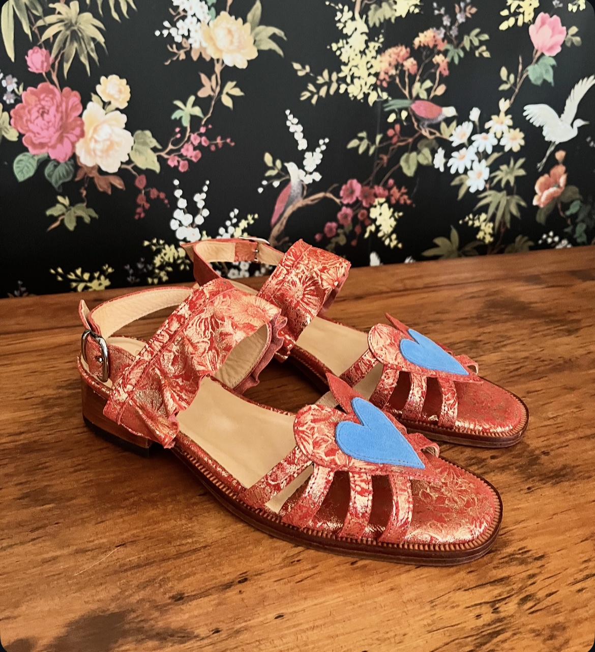 Sandalia de cuero, forradas en cuero y hechas a mano,con correa ajustable en talón, planta de suela y tacón de 4 cm.
